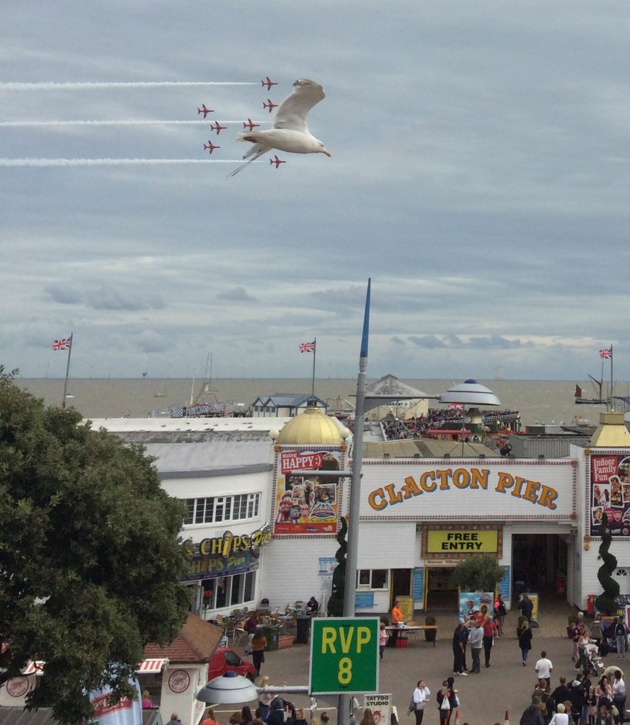 Seagull leading a formation of airplanes